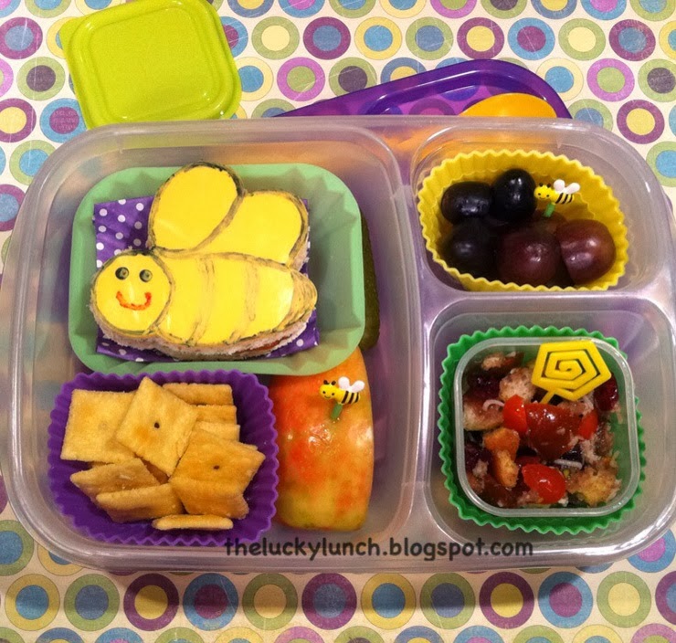 I'm really liking the Yumbox. I usually rush on Tuesday nights to make lunches, and the Yumbox makes it very easy to pack a cute but quick lunch. This lunch took me about 15 minutes to make. I made the dog picks a few days ago by gluing food grade plastic picks to the back of buttons......yep! Those are buttons. They turned out so cute, didn't they?